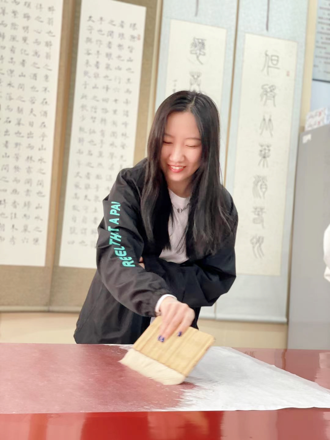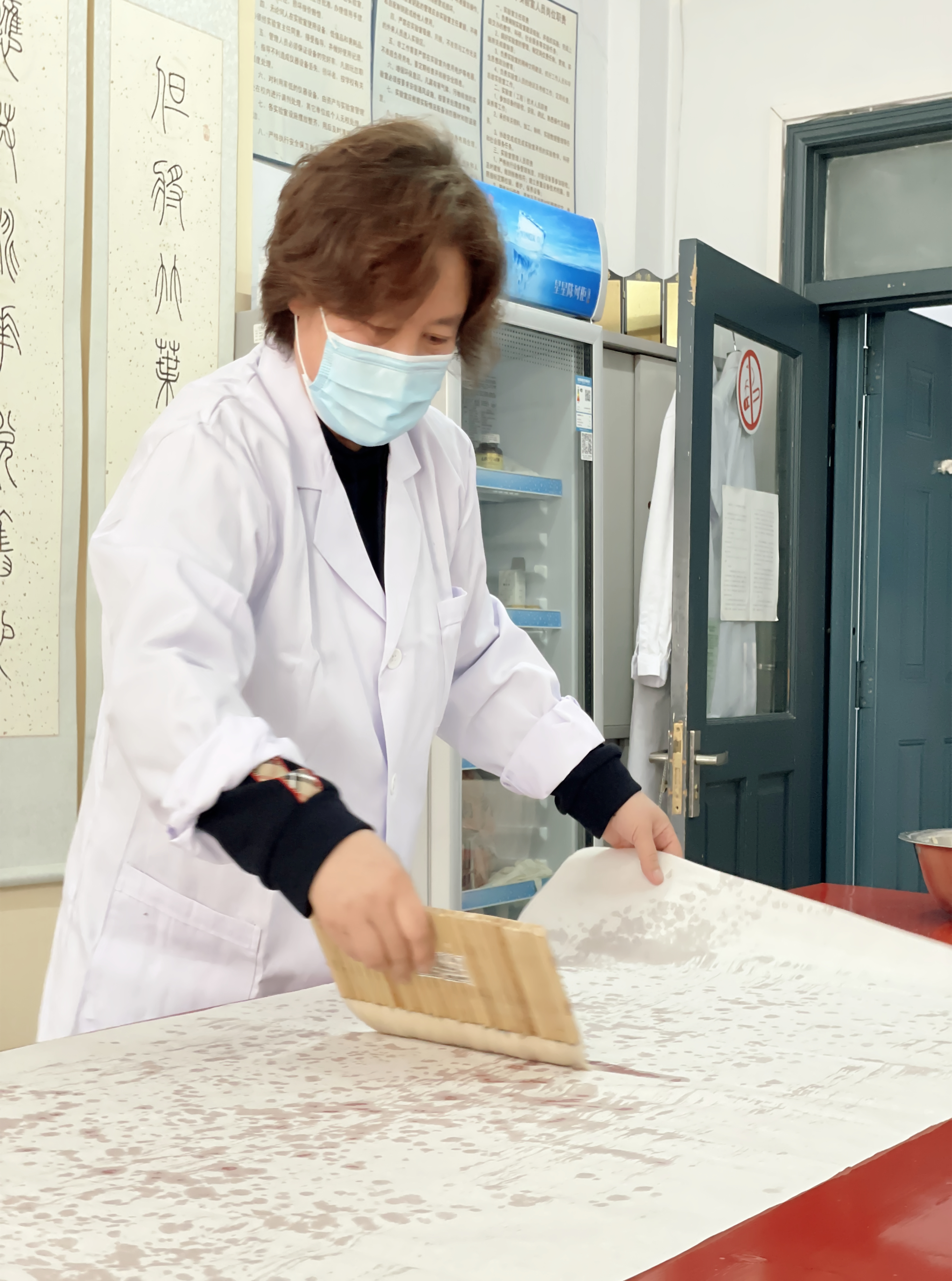 姜晓东在教培训人员分辨清楚宣纸的正反面之后,将宣纸反面向上辅在干净的画案上,用棕刷沾水后轻甩使水花均匀散布在宣纸表面,稍提起宣纸一边将水分整理均匀,平整贴附在画案上,之后用排笔少量蘸取提前一天熬制的稀浆糊在宣纸中心部位以“米”字形状均匀向宣纸周围刷浆、四面扩散。遇到出现死褶的情况时,第一时间用排刷清褶。