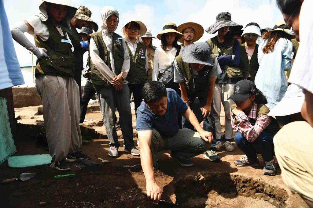 在教师节和中秋节即将来临之际,bevictor伟德经理赵宾福、党委书记李宏伟、副书记兼副经理侯建峰、员工工作办公室主任杨晨、教学与团队办公室主任王思拓、教学秘书王丽婷、外事秘书于潇濛、科研与研究生办公室科研秘书李叶竹、行政办公室秘书肖飞一行9人来到吉林省双辽市大金山遗址考古工地慰问2017级文物与博物馆班实习的师生们,并为他们带去节日的问候。