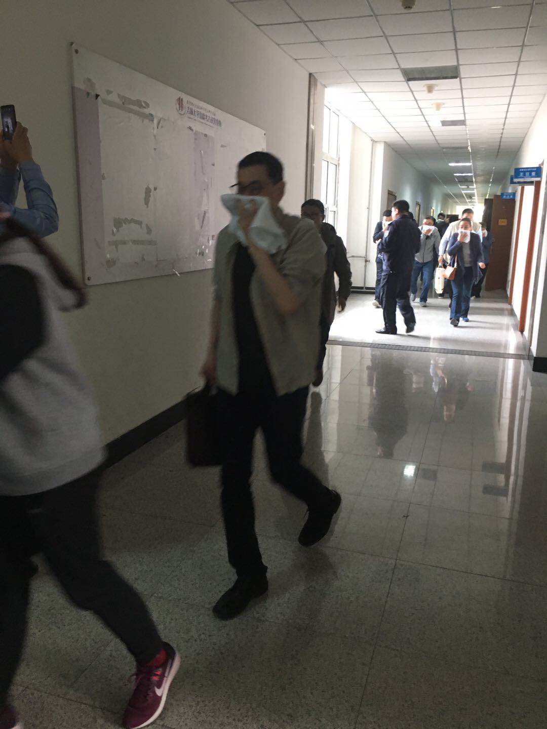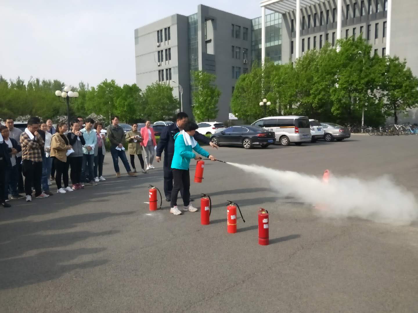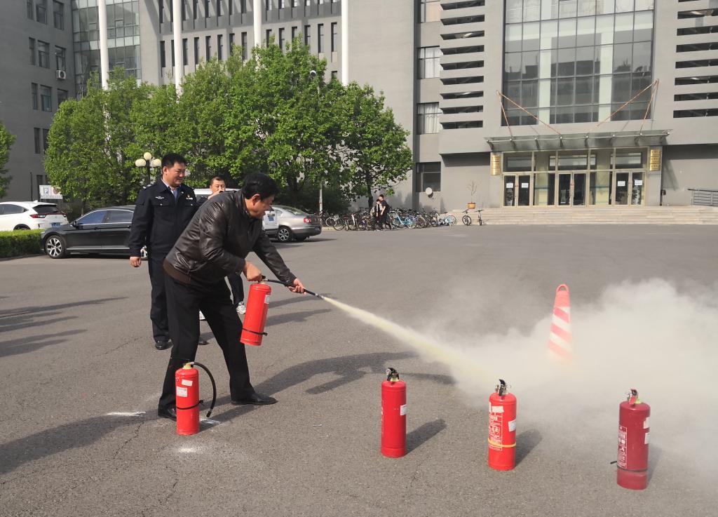 讲座结束后,保卫处在匡亚明楼二楼门前燃放了烟雾弹,随后警报响起,全体师生在引导员的指引下,用毛巾捂住口鼻迅速从各个安全出口疏散撤离。全部人员撤离到安全区域后,在匡亚明楼门前空地设置模拟火情,董立明为大家讲解了灭火器的使用方法及注意事项,并指导师生操作灭火器对初起火灾进行扑救。