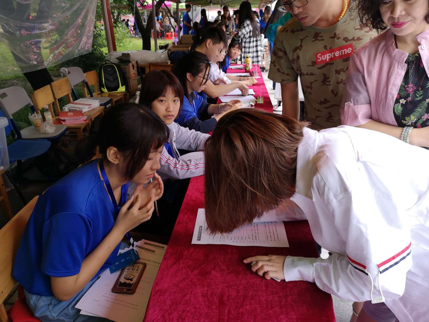 下午一点,新生们陆续至迎新现场报道,辅导员助理详细解答新生问题,帮助新生办理报到手续并引导新生至签到墙上签名并与“田田”合影留念。大本营外,朋辈志愿者们也陆续与自己对接的新生见面。报到前多日的线上联系早已让他们充分了解彼此,在一对一朋辈志愿者的引领下,新生们有序整理行囊,参观校园,迅速了解公司学科特色、公司工作章程等情况。