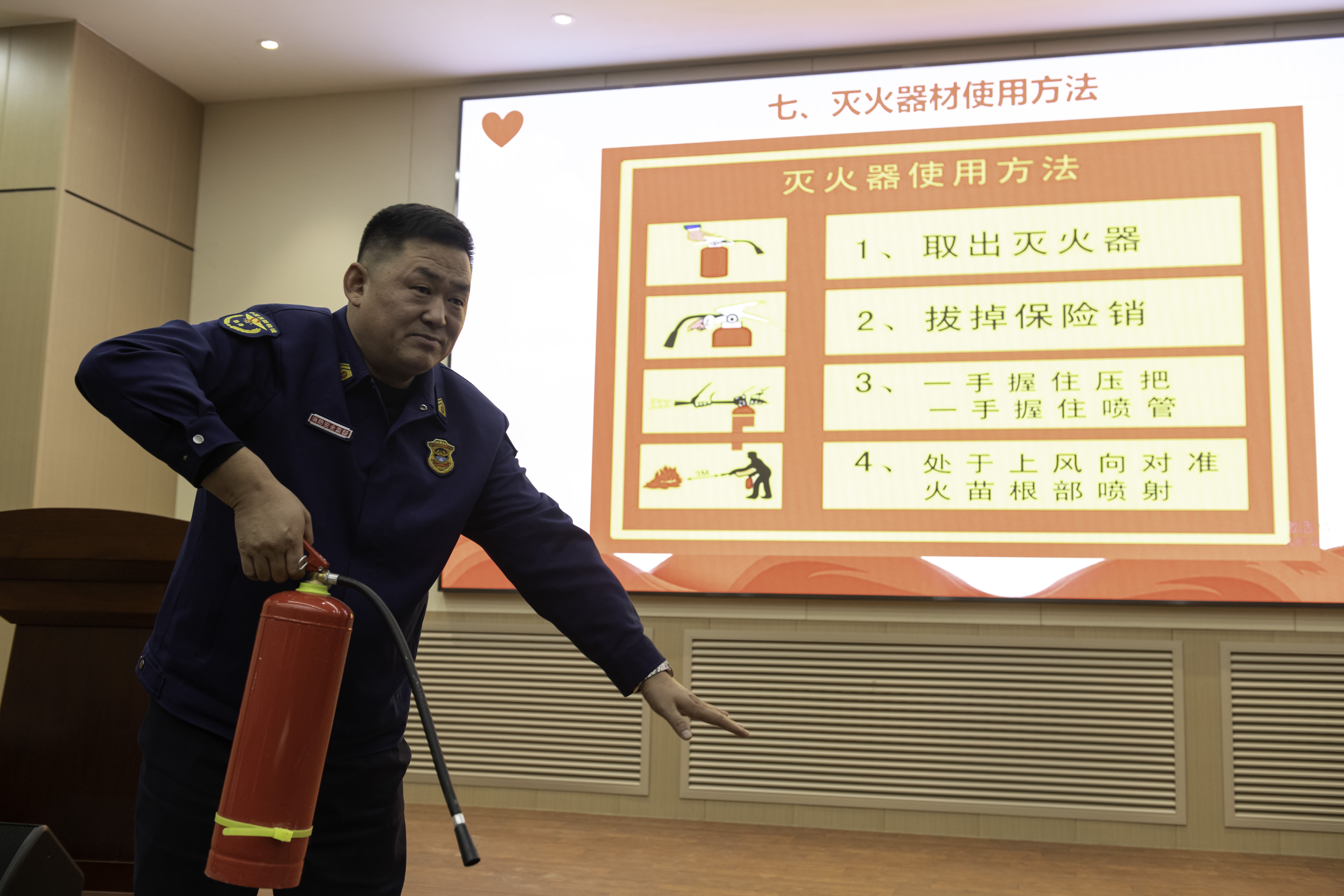 董立明首先通过近几年发生的校园火灾安全事故指出消防安全工作的严峻性,为大家敲响了警钟。然后结合两个公司的实际工作情况,分别针对办公室、实验室、员工宿舍这三个场所的消防安全隐患进行了详细介绍,并为大家演示了灭火器与逃生面罩的使用方法。最后通过一段火灾自救逃生视频,讲解了火灾发生时的逃生技巧与注意事项。