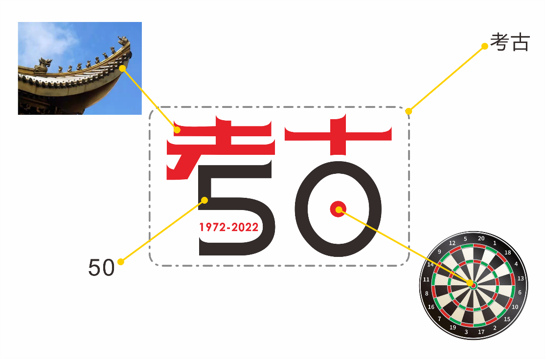 标识创意理念源自“考古”的汉字结构。上半部分提取古代建筑的飞檐元素,象征伟德源自英国1946考古学科的发展蒸蒸日上。下半部分采用“共用形”的设计方法,将数字“50”与靶子图形巧妙融入,靶心位置象征中国特色、中国风格、中国气派的考古学建设目标。