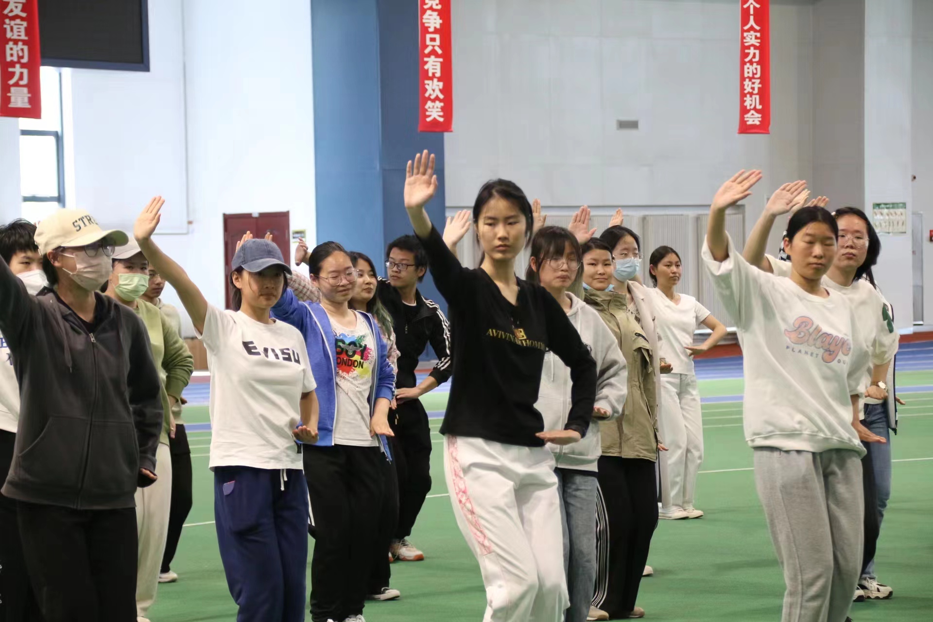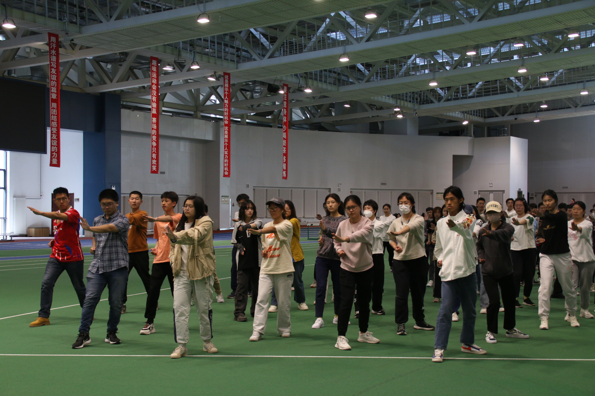 八极拳集训先后于宋志平四楼田径场、篮球场和轮滑场进行。每次的训练内容主要包括整体复习和细节纠错。在领队同学的带领下,同学们逐渐熟练掌握了八极拳的连贯流程,体会到八极拳的动作特点和各招式之间的关联。历次训练中,同学们根据领队同学的指点,反复确认动作要领,力争在充分发挥每一位同学的精气神的同时,改善姿态细节,整齐划一地打出八极拳方队应有的集体风范。经过多次集训,同学们的动作从略显生疏到连贯畅通,愈发深刻地理解了八极拳朴实简洁、刚猛强劲的特点。