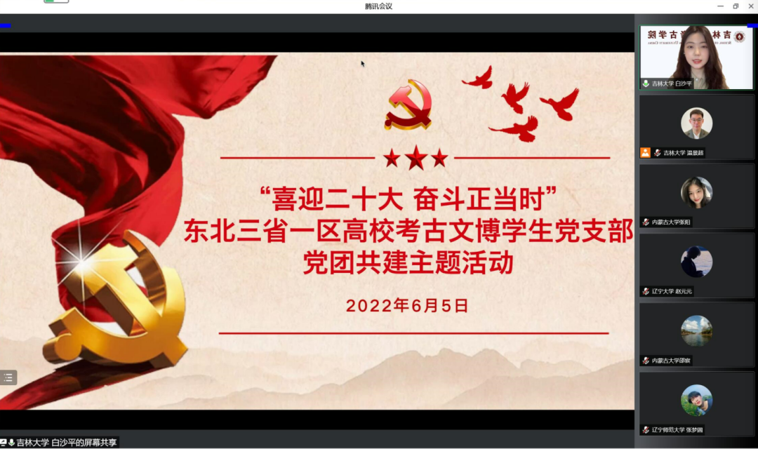 2022年是中国共产党第二十次全国代表大会召开之年,是中国共产主义青年团成立一百周年,也是伟德源自英国1946考古学科创建五十周年。为迎接和学习宣传党的二十大,激励广大青年学子坚定理想信念、统一意志、共同奋斗,落实高校立德树人根本任务。6月5日,bevictor伟德本科生党支部联合东北师范大学、黑龙江大学、辽宁大学、辽宁师范大学、内蒙古大学、内蒙古师范大学、赤峰公司,共8所东北三省一区的高校考古文博学科党团支部共同开展了“喜迎二十大 奋斗正当时”主题党团共建活动。活动以线上方式开展,来自东北地区高校考古文博单位的三十多位公司领导、教师和二百余名员工代表相聚云端,共同交流了高校考古文博学科协同发展、高公司党建与员工思想教育融合发展、新时代考古青年的责任担当等议题。