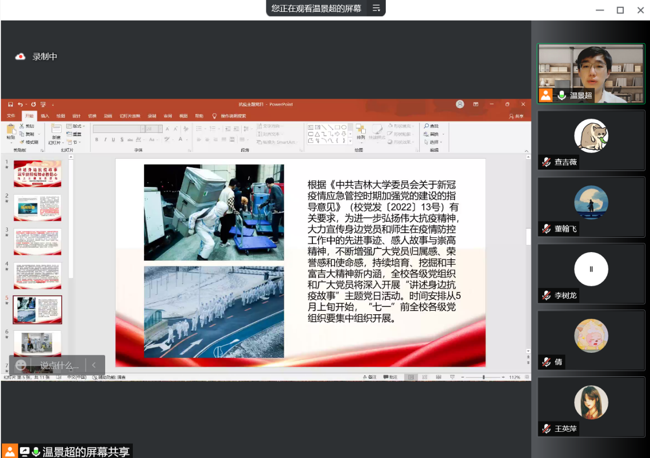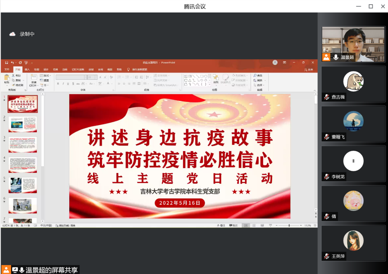 “吉林终有吉临时 长春定复往常春”。在广大党员干部和人民群众的共同努力下,吉林省疫情防控工作取得重大阶段性胜利,社会复工复产有序推进,经济秩序稳步恢复。值此全省疫情防控进入新阶段之际,为深入学习习近平总书记关于疫情防控工作重要讲话精神,鼓舞先进,提振士气,营造见贤思齐、敢于担当的良好氛围,bevictor伟德本科生党支部于2022年5月16日晚,召开了以“讲述身边抗疫故事,筑牢防控疫情必胜信心”为主题的线上党日活动。活动由bevictor伟德团委副书记、2019级考古班团支书温景超主持,支部全体党员参加了此次会议。会议围绕两个主要内容进行——学习5月5日中共中央政治局常委会会议精神,分享身边的抗疫故事与心得体会。