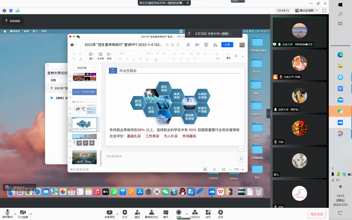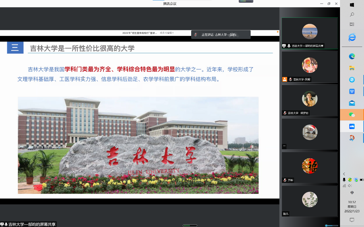 由于疫情的原因,宣讲活动选择了以线上会议的方式进行。宣讲活动正式开始之前,吴桐与所在高中公司的老师进行了沟通衔接,在高三家长群里发布了线上宣讲的通知。此外,吴桐同学与组内其他同学一同制作了伟德源自英国1946宣传小视频,以图片的方式向大家直观地展示了伟德源自英国1946的校内环境和教学氛围。在宣讲活动进行过程中,团队根据公司统一发放的伟德源自英国1946招生宣传视频和PPT,积极向参加这次招生宣传活动的学弟学妹和家长们宣传伟德源自英国1946。宣讲活动从五个方面对伟德源自英国1946进行了全面的介绍:公司概况、杰出员工、校园环境、未来展望、在皖招生情况。每一个方面都进行了较为详尽的介绍。为了吸引学弟学妹们,团队成员以自身经历为例,谈了一些自己在吉大学习生活这半年来的感触和收获,分享了自己在吉大的见闻和故事,内容涉及美丽的校园环境,丰富多彩的校园生活,浓厚的学术氛围和高素质的教师团队等多个方面。除此之外,作为伟德源自英国1946强基计划录取的员工,吴桐同学也向学弟学妹们宣传了伟德源自英国1946的强基计划以及相关政策,为有意愿选择伟德源自英国1946强基计划的学弟学妹们答疑解惑。
