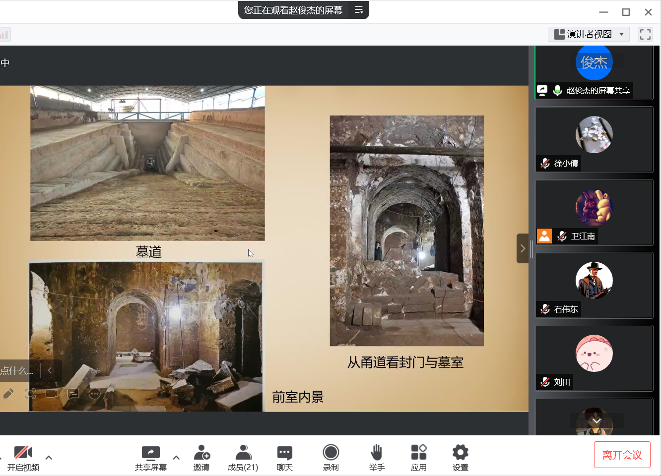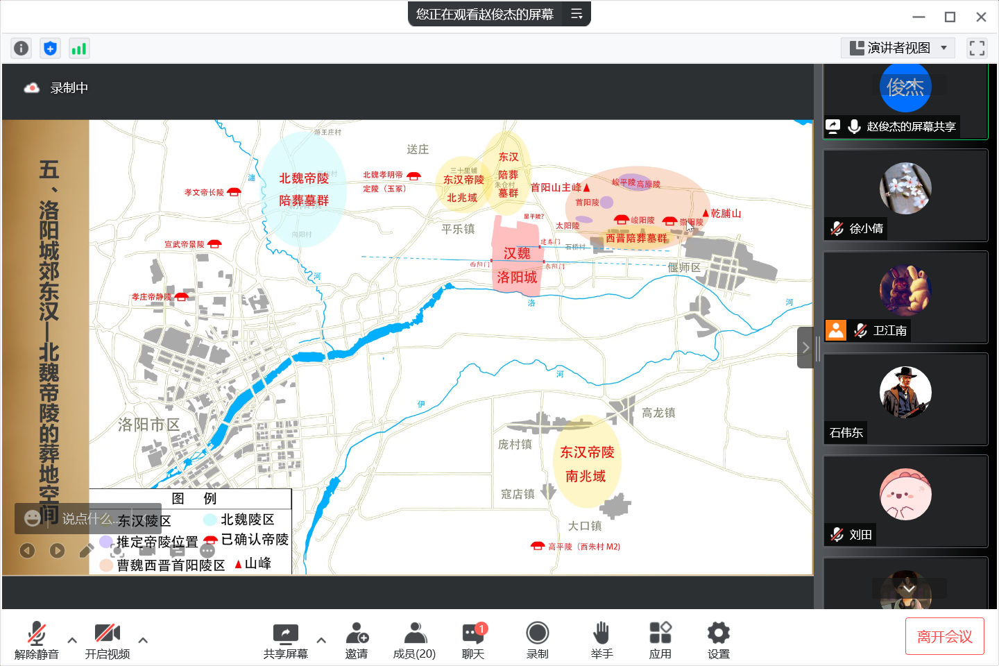 最后,赵俊杰老师以东汉-北魏洛阳城郊帝陵的葬地空间的介绍,结束了本次精彩的“云游”魏晋帝陵之旅。在本次活动中,学术讲解与互动环节交融穿插,同业们纷纷从活动主题中,找到与自己兴趣相契合的内容积极发问。赵俊杰老师亦十分欣赏同学们踊跃互动的求知欲,并称赞道同学们能把新学习到的知识与旧知识融合贯通,同时一一给予详细的答疑解惑。整体课堂氛围不失轻松愉快,师生交流的学术问题也不失深度。