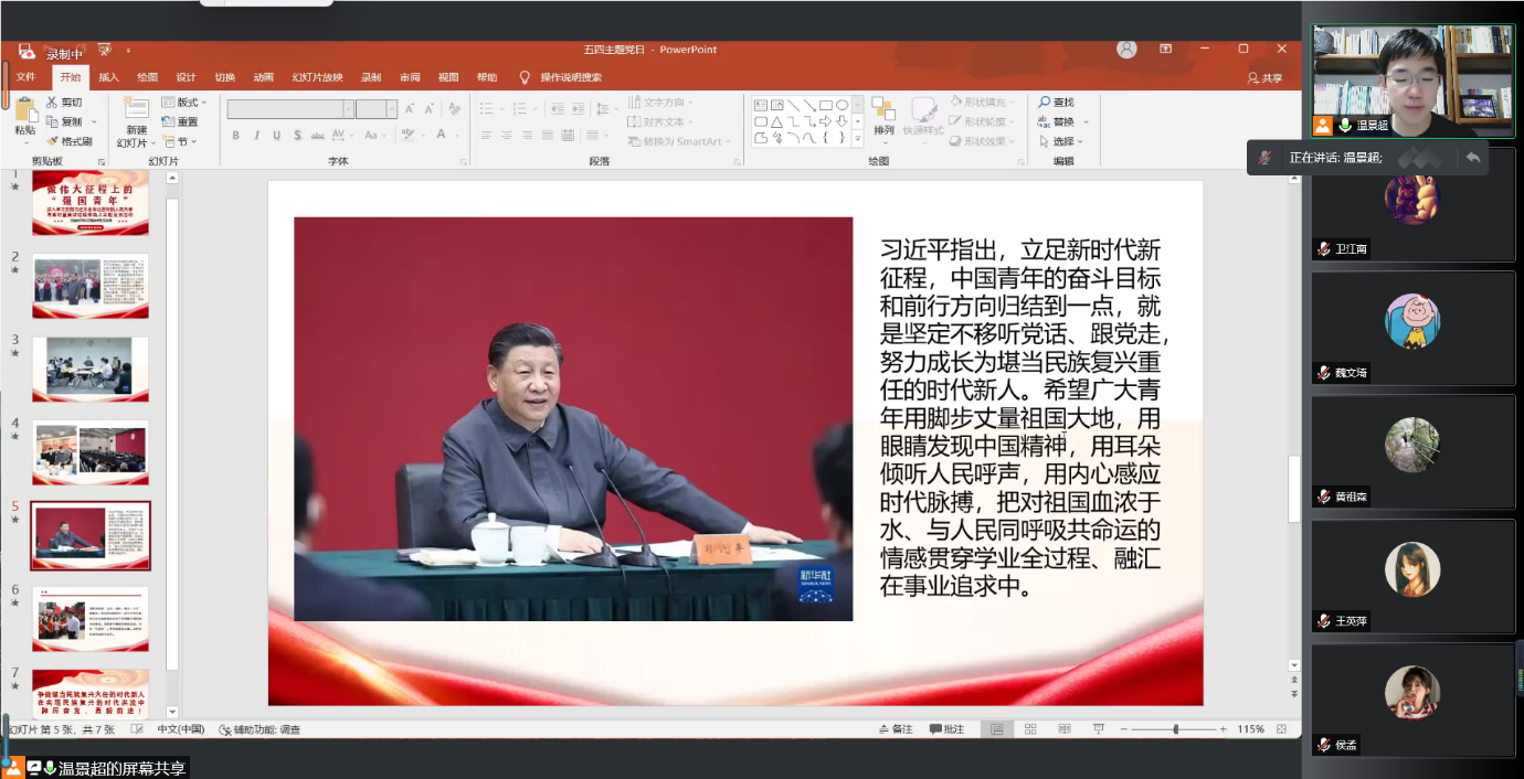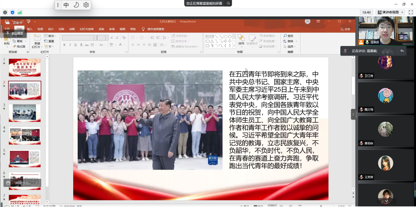 朝雨悒轻尘,青青柳色新。在五四青年节即将到来之际,习近平总书记到中国人民大学考察调研并发表重要讲话。为深入学习贯彻习近平总书记在中国人民大学考察时的重要讲话精神,加强本科生党员理论学习,提升党性修养,bevictor伟德本科生党支部于2022年5月5日晚八时,召开了线上主题党日活动。会议由bevictor伟德团委副书记、2019级考古班团支书温景超主持。
