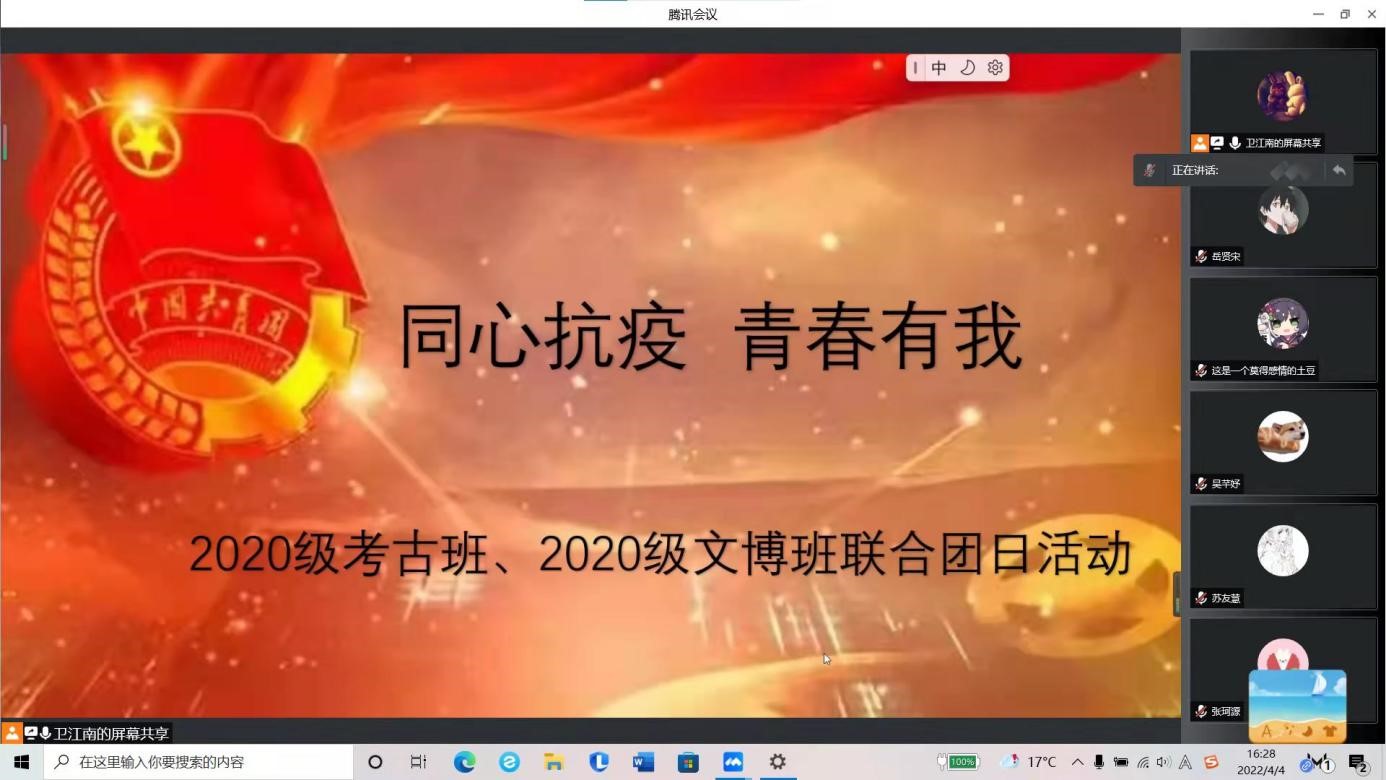 为深入学习贯彻习近平总书记关于疫情防控的重要指示精神,进一步加强疫情防控期间员工的思想引导,缓解心理压力,凝聚防疫信心,充分发挥团学组织在防疫抗疫和志愿服务中的先锋模范作用,2022年4月11日,bevictor伟德2020级考古班、文博班联合开展了“疫情防控、与我同行”线上主题团日活动。会议由考古班团支书卫江南主持,辅导员马嘉男老师和2020级全体同学参与。