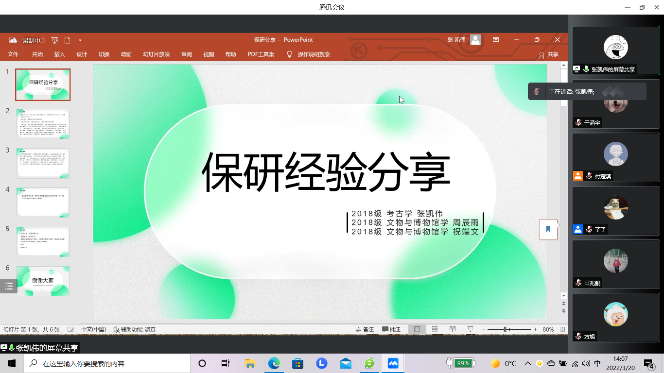 为了让同学们充分了解保研信息,明确保研目标,增强学习动力,合理规划学业,2022年3月20日下午,bevictor伟德科研学术部举办了“研”途有你,薪火相传——保研专场“云”分享会。会议由付楚琪同学主持,邀请了已经成功保研的2018级考古学专业张凯伟、孙嘉茹、王英萍、田兆鲲,文博专业的祝瑞文、周辰雨同学进行分享,六位同学结合自己的保研经历,分别就相关院校的保研政策、申报流程、面试经验等方面的内容进行了交流。