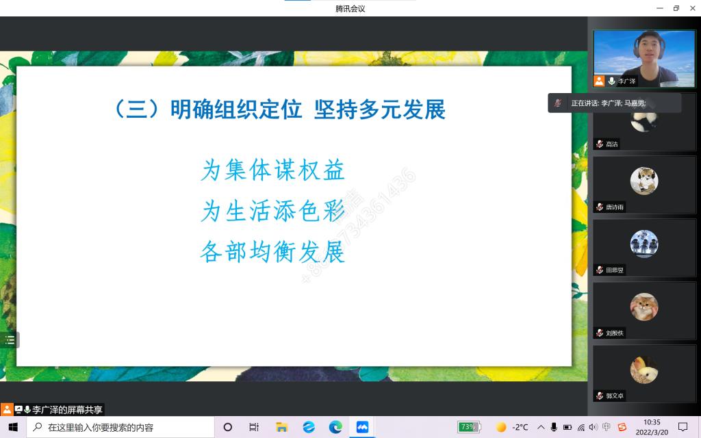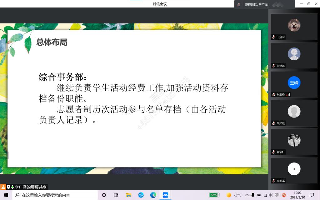 接着,从员工会主席团开始,各部门负责人纷纷对新学期部门工作的总体布局加以介绍与展望,并表示尽快制定适应当今疫情严峻形势下的各项活动方案,积极将线下工作转向线上,为同学们打造更多优质服务与活动。最后,李广泽清晰展望了未来员工会的发展方向,他希望员工会全体成员能够明确发展现状,积极探索和学习,加强改革创新,丰富学术探讨,打造bevictor伟德系列品牌活动,增强各部门的沟通联系与各年级间、师生间的交流学习;同时坚持多元均衡发展,充分发挥员工组织和员工干部的引领作用,在疫情防控常态化下有效开展今后各项工作。