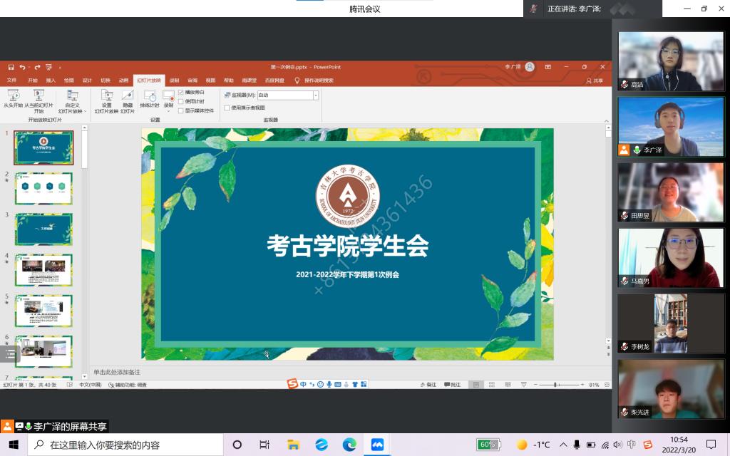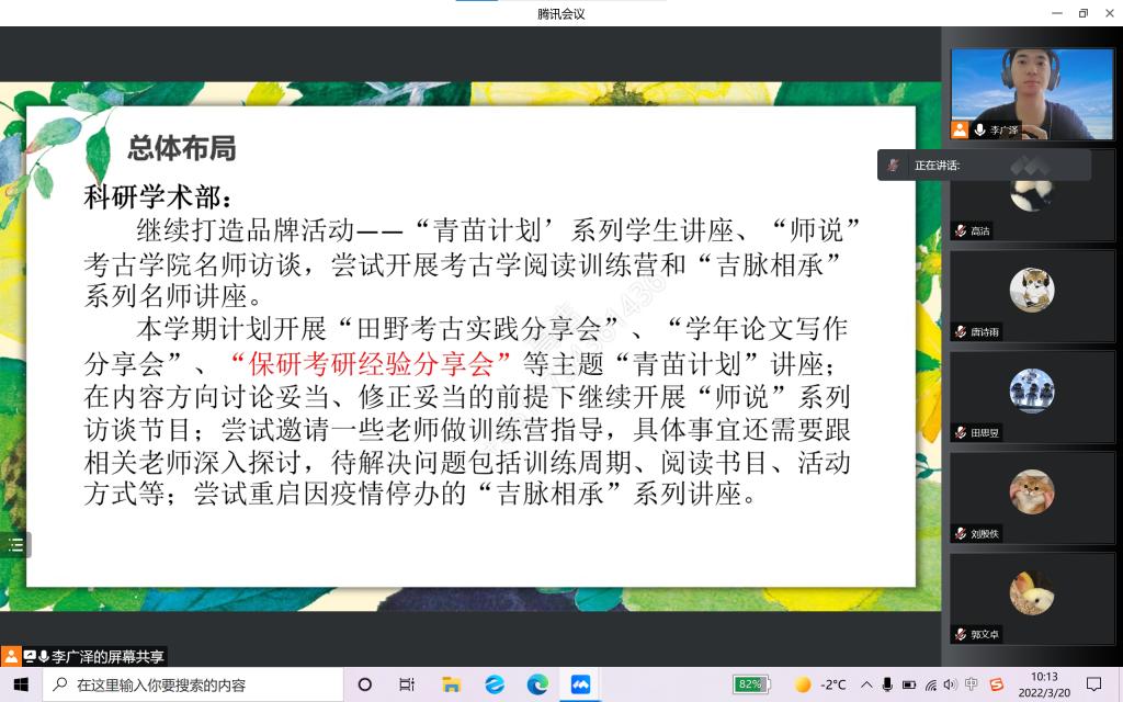 会议共有三项议程,即工作回顾、总体布局以及讨论答疑。会议伊始,李广泽首先总结汇报了员工会过去一学期的主要工作成果。上学期,各部门齐心协力策划并成功开展了若干活动,如百年考古百年党定向越野特别纪念活动、“青苗计划”系列活动、“我与吉大一百天”作品征集活动等,广受师生好评。同时,也对工作中出现的创新不足、特色不明等问题进行了反思,提出了立足专业基础,开展公司特色活动等想法。随后,公布了“志愿者制”这一创新性分工合作制度,以期较好地培养锻炼员工会成员综合能力,激发大家工作的积极性。最后,向全体成员阐明了专业学习的重要性,学习是老员工的第一要务,员工会成员要平衡好工学矛盾,在认真学习专业知识的基础上,更好地开展各项员工工作,从而建设更具先进性、引领性的员工组织。