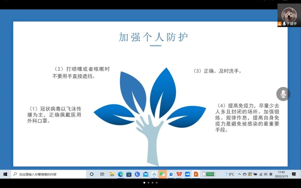 3月17日下午,bevictor伟德2021级一班以“疫情下的我们”为切入点召开了主题班会。会议旨在展示公司人文关怀、宣传线上活动,呼吁同学理性对待疫情。长春疫情发生以来,我班同学积极响应公司号召,在全民抗疫的形势下,不添乱不增负,严格遵循防疫需求,减少人员接触,做好个人防护。在线上课程学习中,我班同学努力认真,不缺课不漏课,完成老师布置的教学任务,不因为线上学习就有所松懈,积极向上,努力成长成才。不仅如此,我班同学还踊跃报名志愿服务,帮忙发放寝室物资,为抗击疫情尽自己的一份力,培养了互帮互助的友好氛围,树立了家国情怀和责任担当意识。