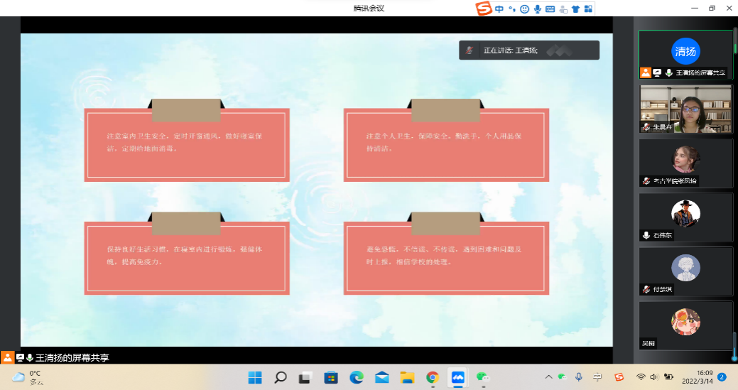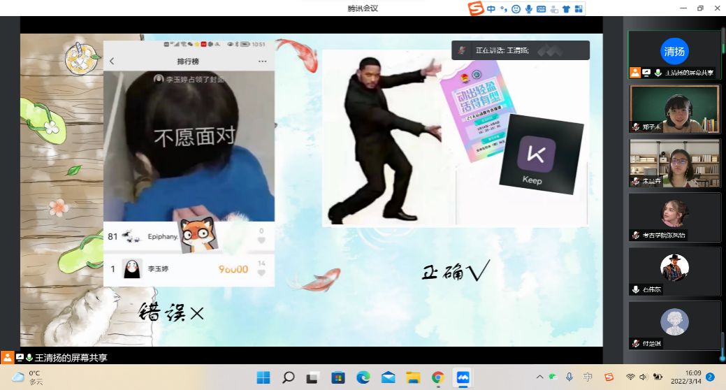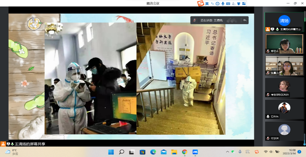 3月14日下午,按照公司防疫工作部署,2021级古文字班于线上组织开展了疫情防控导学主题班会。会议由班长王清扬同学主持。