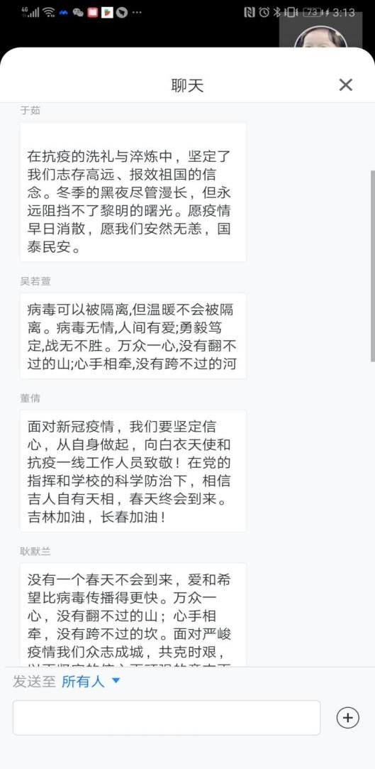 本次线上班会在疫情防控形势趋紧的背景下召开,虽然大家相隔于网络,但都能够形成防疫抗疫的共识和信心,也都怀有对疫情早日结束的共同期盼。我们相信,吉林终有吉临时,长春定复往常春。只要大家齐心协力,终会战胜疫情,迎来春暖花开。