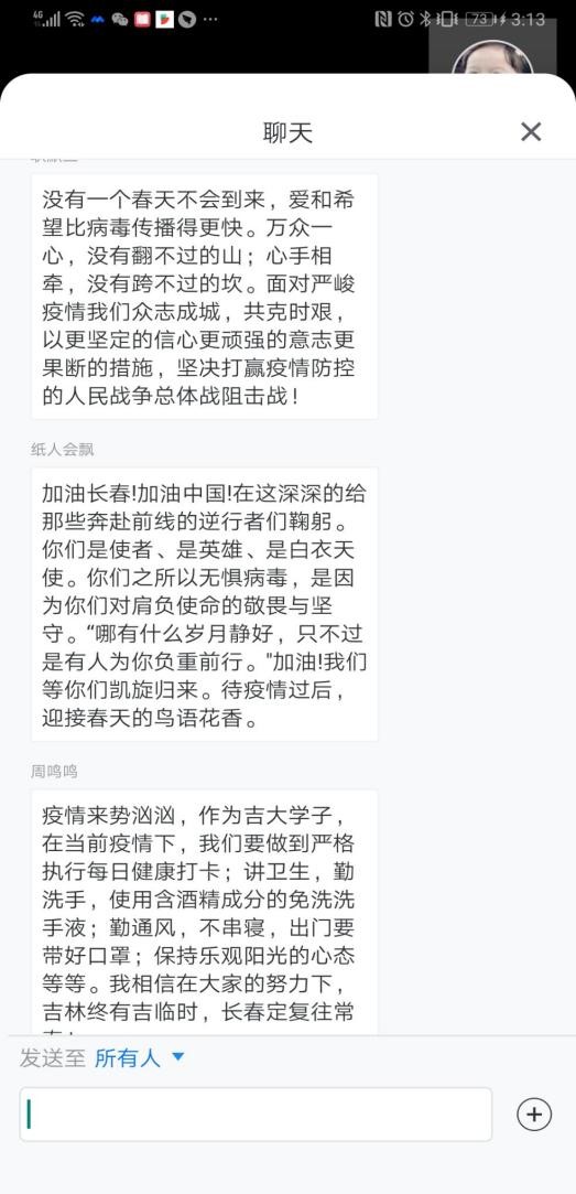 下午三点,会议准时开始。首先,团支书耿墨兰向各位参会同说明了本次举行线上会议的主题,并向大家分享近段时间以来长春市和公司的疫情防控形势,要求大家做好个人防护,配合公司打好疫情防控阻击战。随后,冯楠老师鼓励各位同学踊跃发言,阐述自己关于抗击疫情的感想和抗疫宣言。会议上,大家积极献言,很多同学表达了鼓励同学、感谢一线工作人员的感言。大家用朴素而真挚的语言表达了对抗疫必胜的决心与信心。会议最后,冯楠老师向各位同学转达了公司以及公司对大家身体的密切关注,并再次强调了在宿舍封闭管理期间的注意事项。