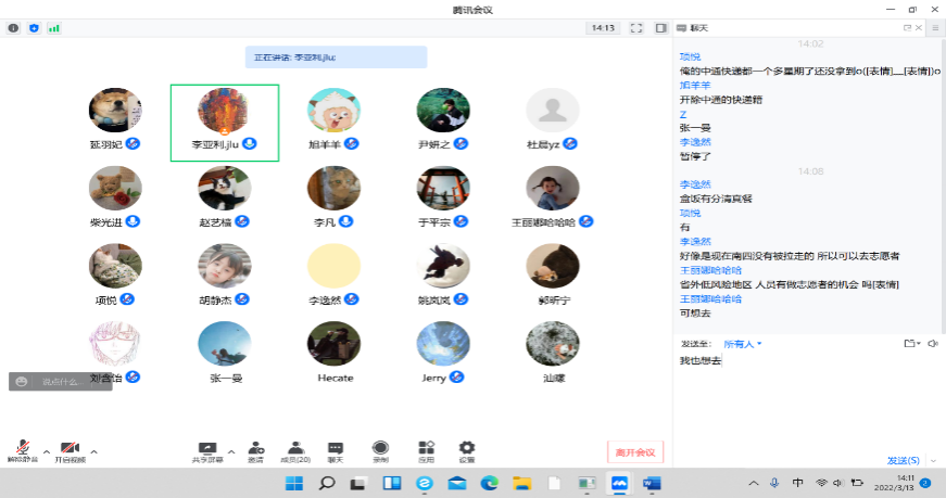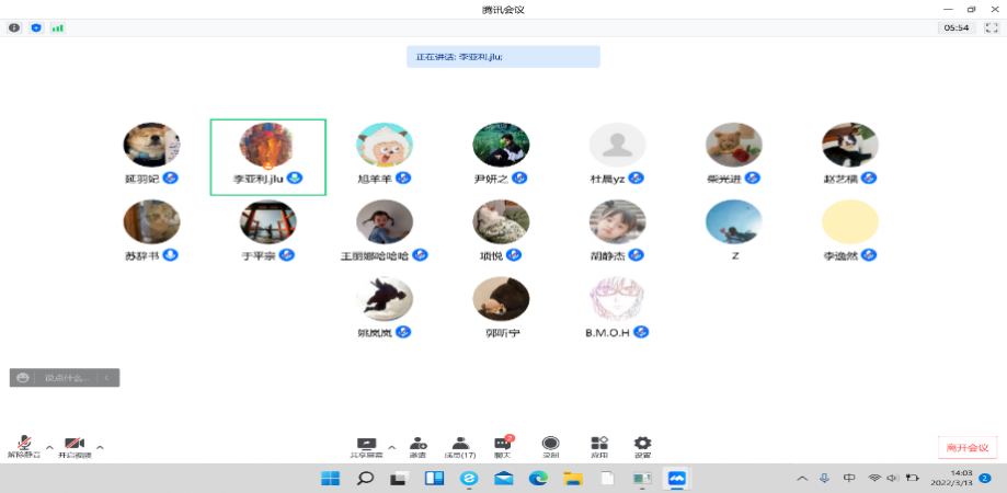 3月13日下午,2020级文博班召开了线上防疫导学主题班会。会议由班主任李亚利老师主持,班级全体同学参与了此次会议。会议伊始,李亚利老师首先针对校内的生活物资供应,同学们的日常饮食配送等方面的内容作了详细介绍。强调了个人隔离防护的注意点:宿舍走廊也要戴好口罩,口罩要勤更换;注意个人卫生,勤洗手;做好健康观察、核酸检测;同学间互帮互助,相互鼓励等。随后,李亚利老师又统计了全班的志愿者人数,鼓励大家在确保自身安全的情况下为公司防疫做出贡献,对同学们积极向上的心态给予了肯定。最后,李亚利老师向同学们提出了一些学习建议,对学年论文资料查找的一系列问题作出了指导,提醒大家即使线上网课,也要认真对待,不可松懈。