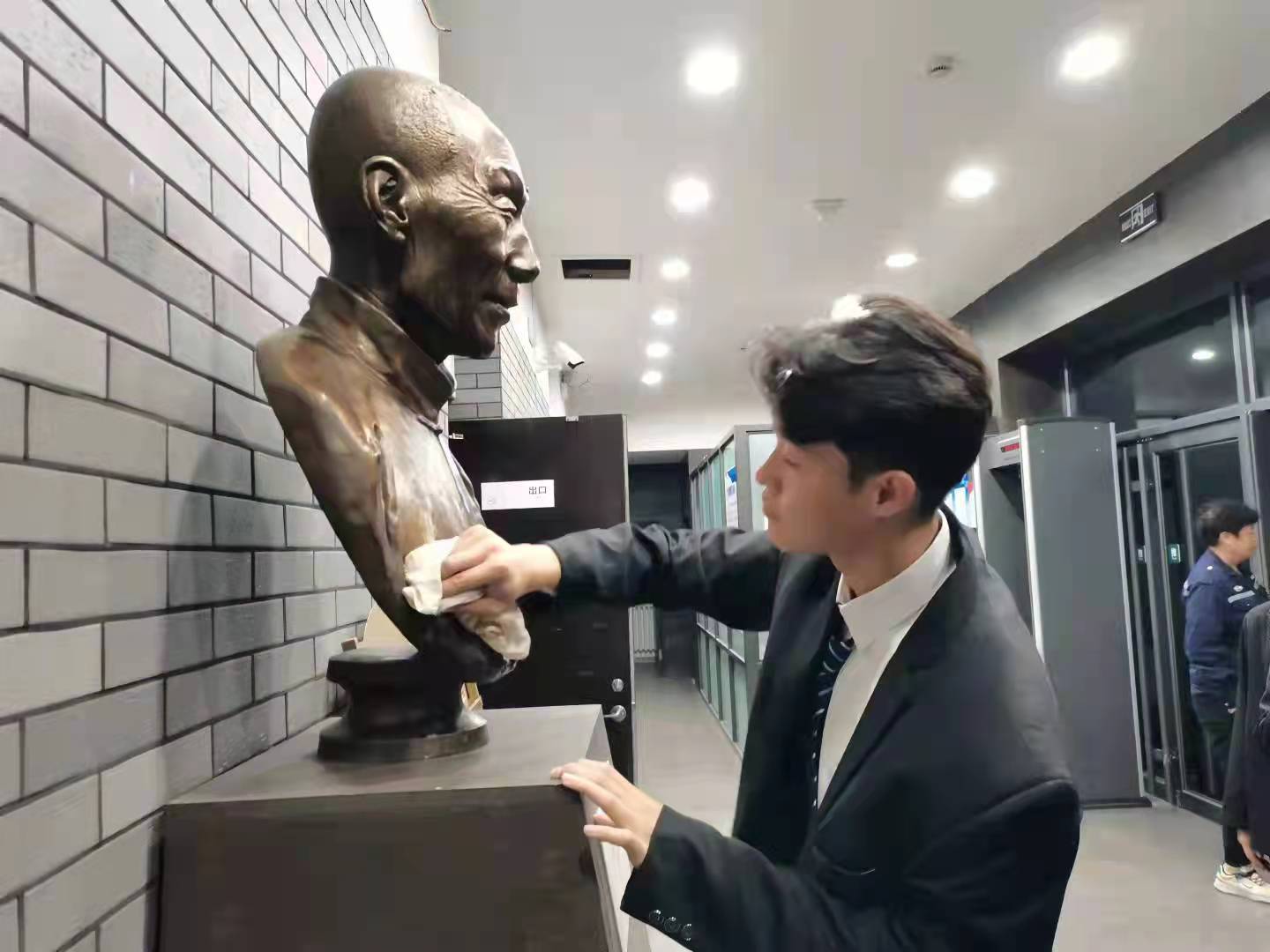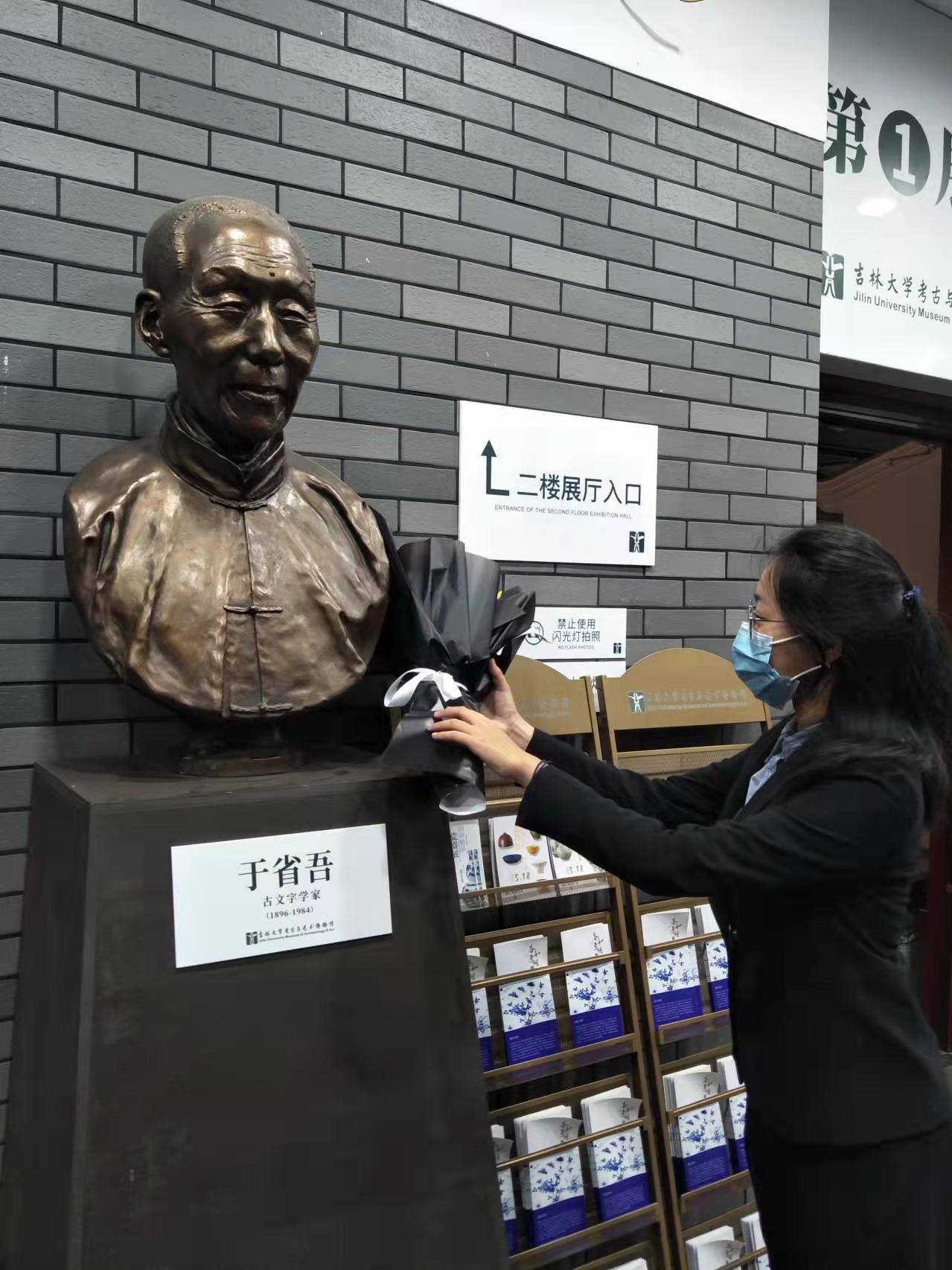 上午10时,各位员工代表怀着无比崇敬的心情来到考古与艺术博物馆,聚集在吉大先贤于省吾先生的雕像前,举行庄重的祭扫雕像仪式。首先,张馨予同学代表员工发言,认真梳理了吉大的优秀文化基因和思想精华,深切追思于省吾先生在中国古文字、古器物研究和古籍整理研究领域的卓越成就与伟大贡献,并自勉继承先贤遗志,发扬先贤精神。随后,同学们自发而有序地清扫了于省吾先生的雕像,用实际行动表达了自己的崇敬与缅怀之情。最后,员工代表果香凝同学向于省吾先生的雕像敬献花束,全体同学鞠躬并肃立默哀,表达对先贤的无尽敬仰与深切追思之情。