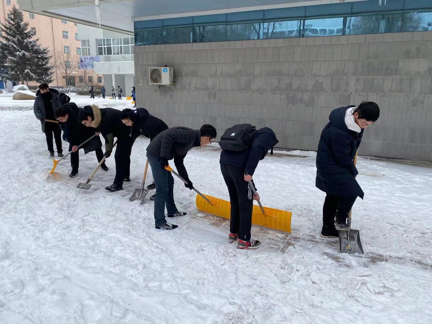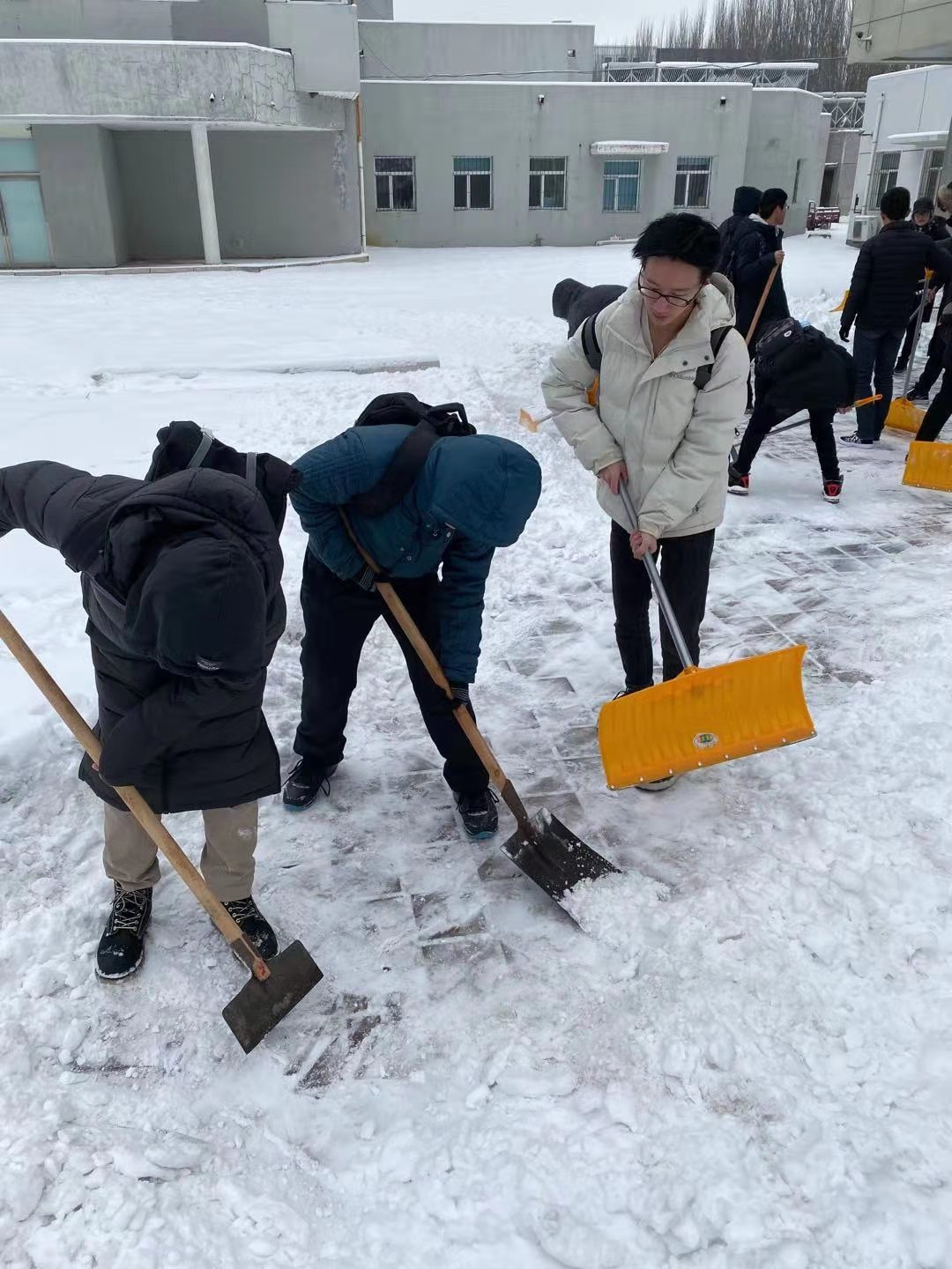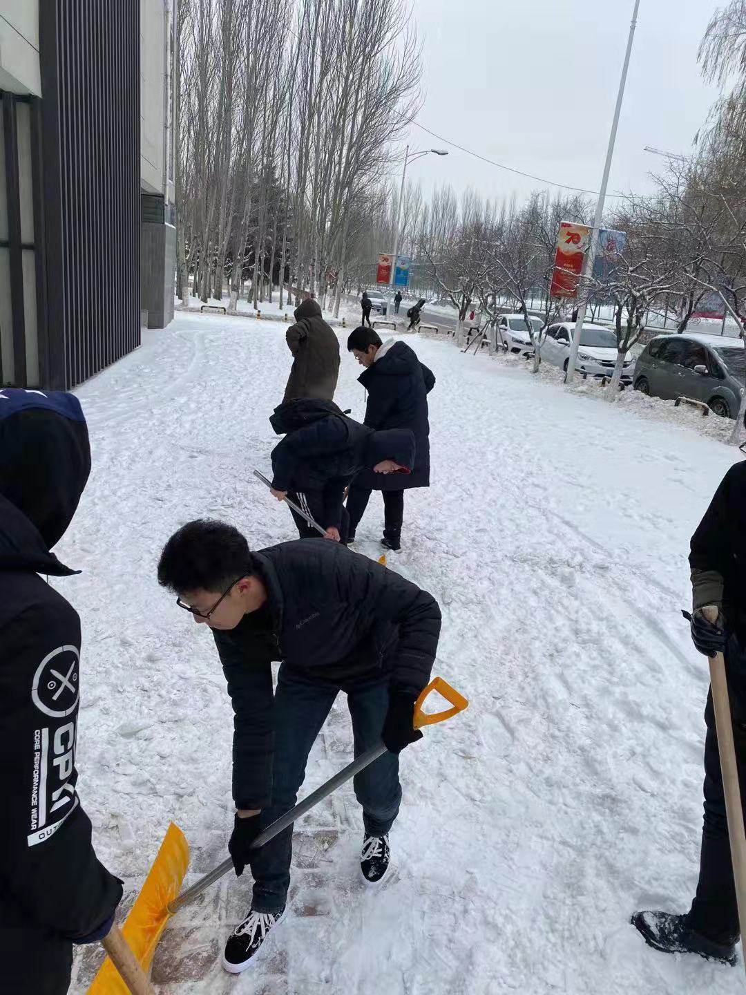 正值降温,今天同学们感受到了这个冬天以来最低的气温,冰雪也凝结得十分坚硬,但同学们的热情却丝毫没有减退,在入党积极分子们的带领下,经过一个半小时的团结协作,大家将博物馆门前的道路清理得干干净净。行人踏上不再被积雪占据的道路,脚步变得轻快,不再被泥泞所困扰,同学们看到后都感觉十分欣慰。清雪结束后,同学们又发挥自己的创造力在博物馆门前堆起一个小雪人,记录下用劳动服务大众所收获的快乐与友谊。