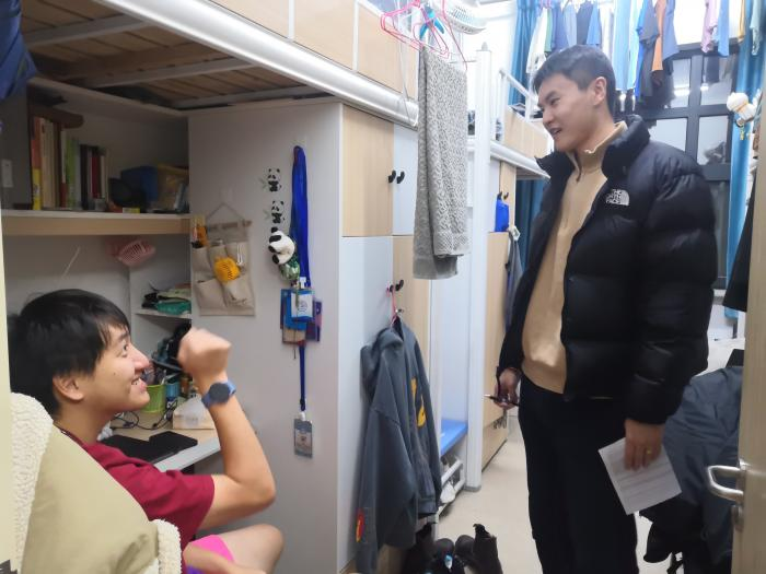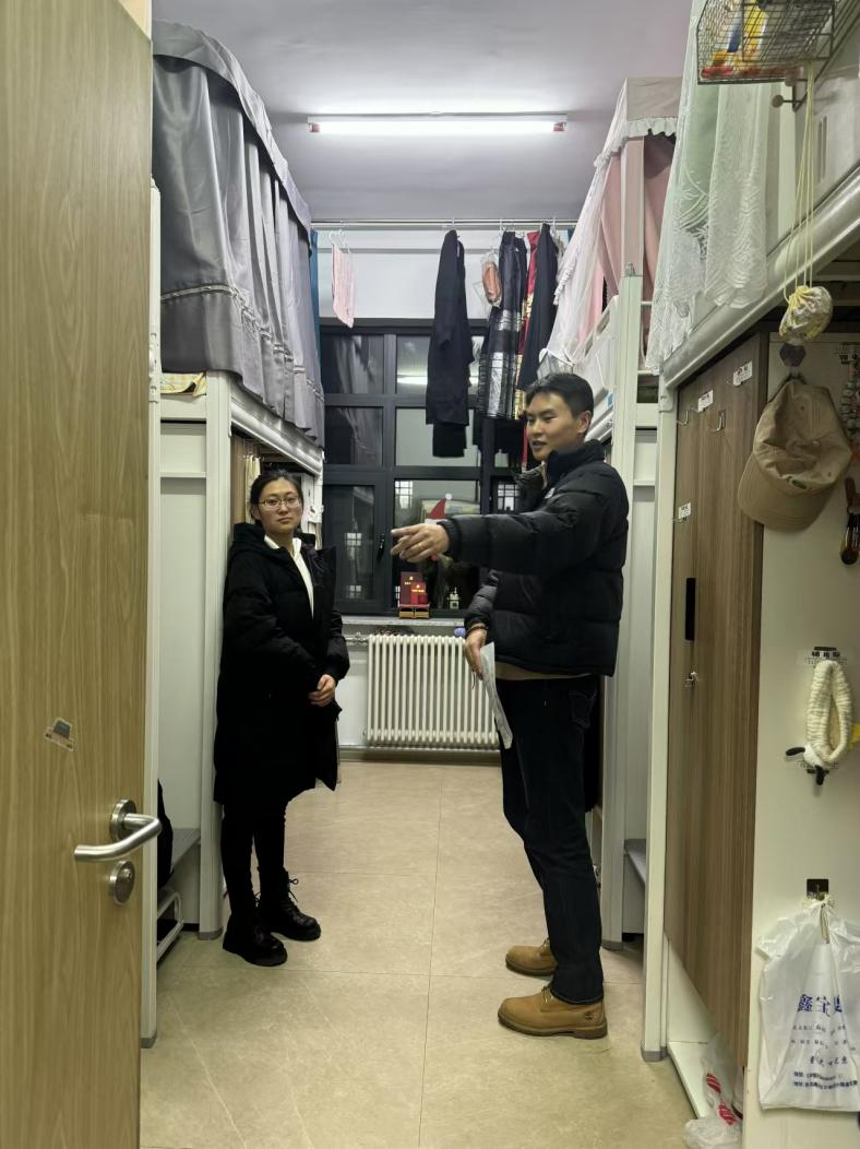 本次工作针对员工寝室卫生情况、使用大功率电器、宿舍设施条件等内容进行重点排查。排查过程中,依德日贡老师告诫员工禁止使用违规电器,时刻牢记公寓用电安全。同时,叮嘱大家要保持宿舍干净卫生,勤于通风换气,预防感冒。师生之间还就员工学业、生活等方面近况进行沟通交流,老师认真倾听员工心声,给予鼓励和建议。