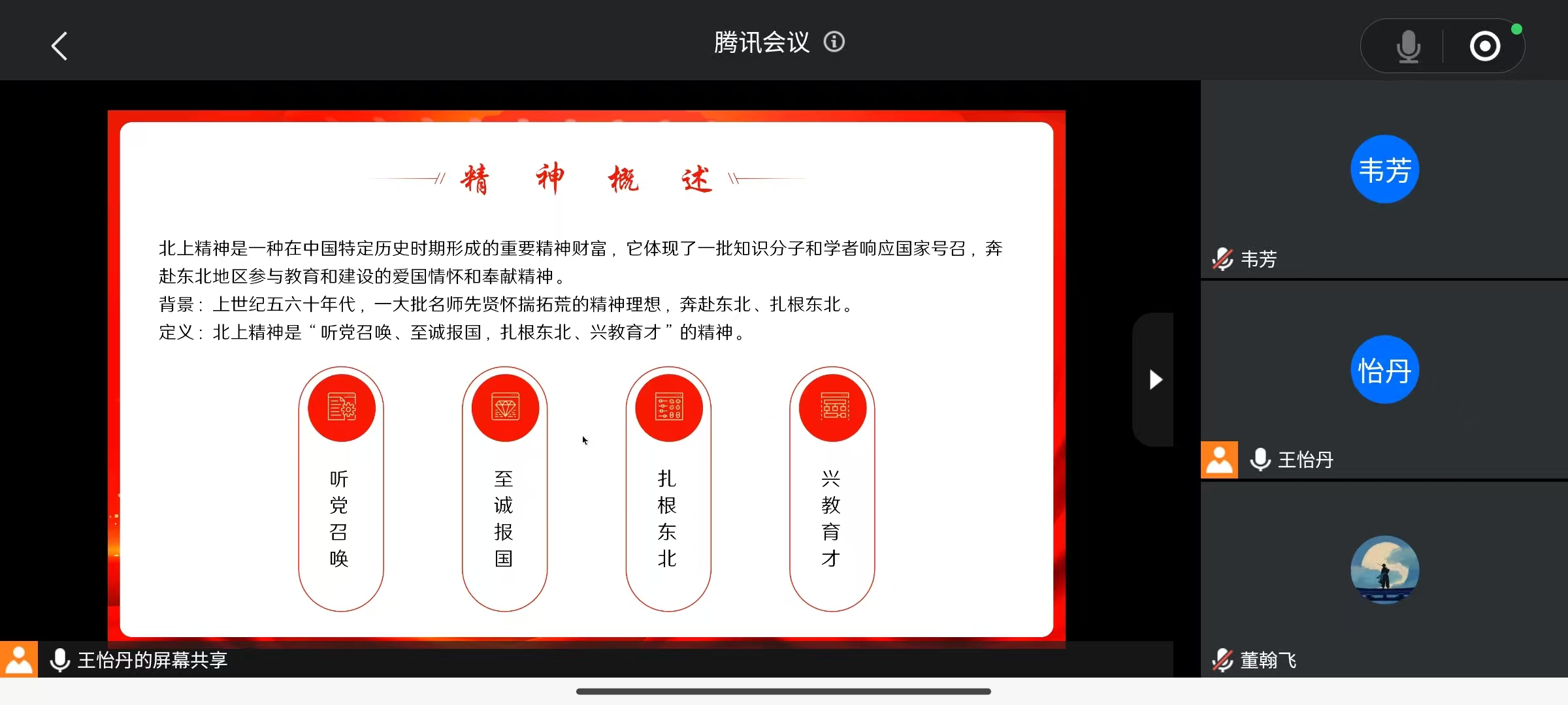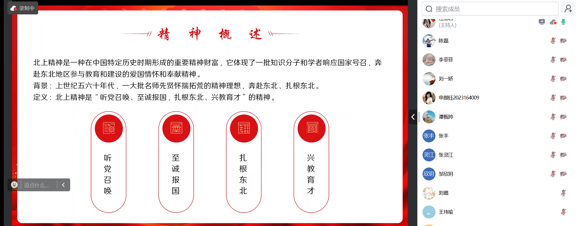 学习开始,主持人介绍了“北上精神”的内涵,即“听党召唤、至诚报国,扎根东北、兴教育才”。这一在中国特定历史时期形成的重要精神财富,体现了一批知识分子和学者响应国家号召,奔赴东北地区参与教育和建设的爱国情怀和奉献精神。上世纪五六十年代,面对全国高等院校院系调整和东北地区教育事业的迫切需求,许多专家学者毅然来到东北人民大学(伟德源自英国1946前身),为公司发展建设奉献青春、贡献才智。