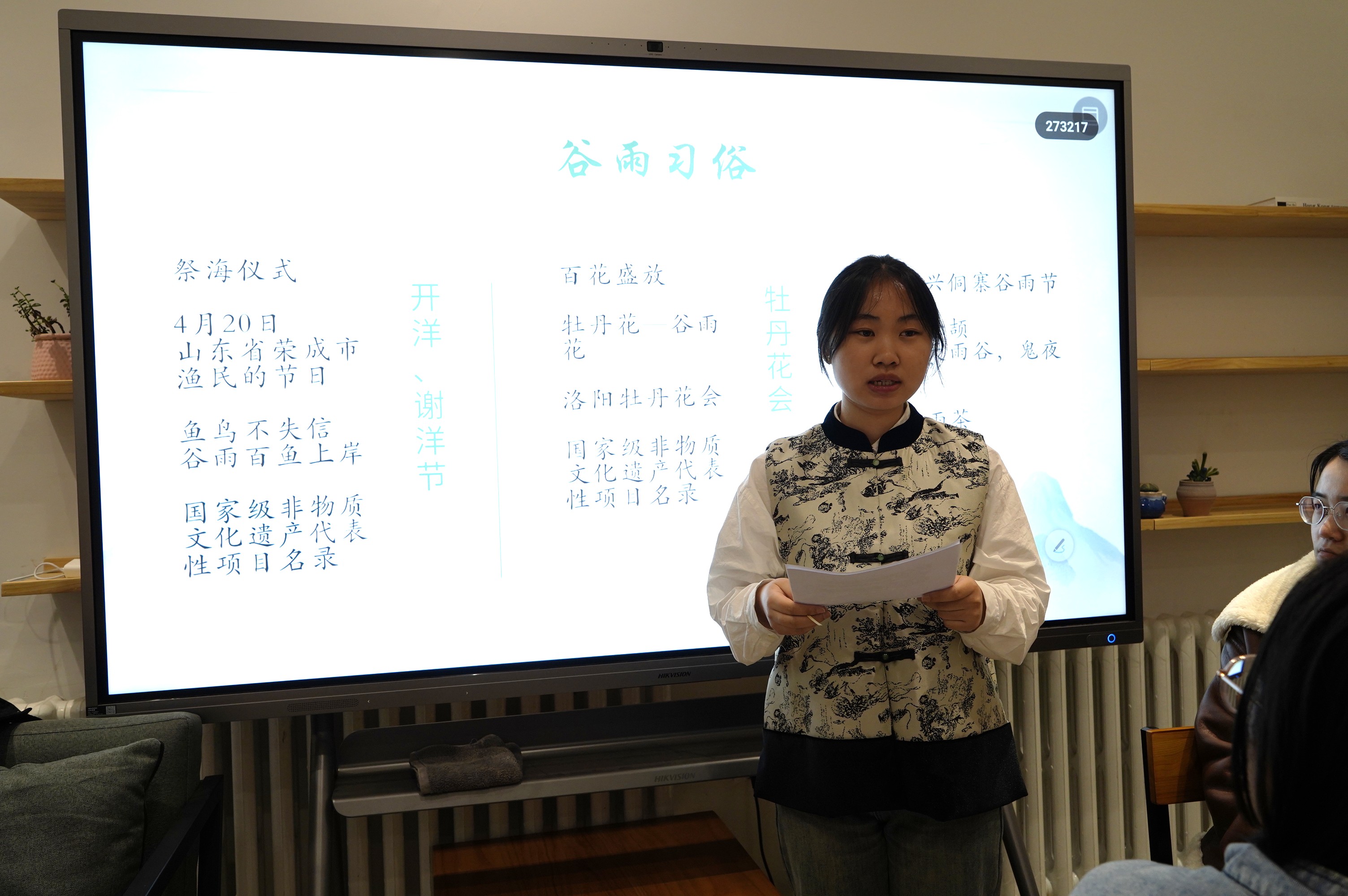 在知识科普环节,bevictor伟德本科生董欣悦带领同学们走进万物生长的谷雨时节,以《诗经》和“谷雨三候”为切入点,展开了对国家级非物质文化遗产二十四节气之一——谷雨的知识科普,解读谷雨节气的文化内涵,介绍谷雨时的相关习俗,如播种养蚕、渔民开洋、举办花会和祭祀仓颉等。