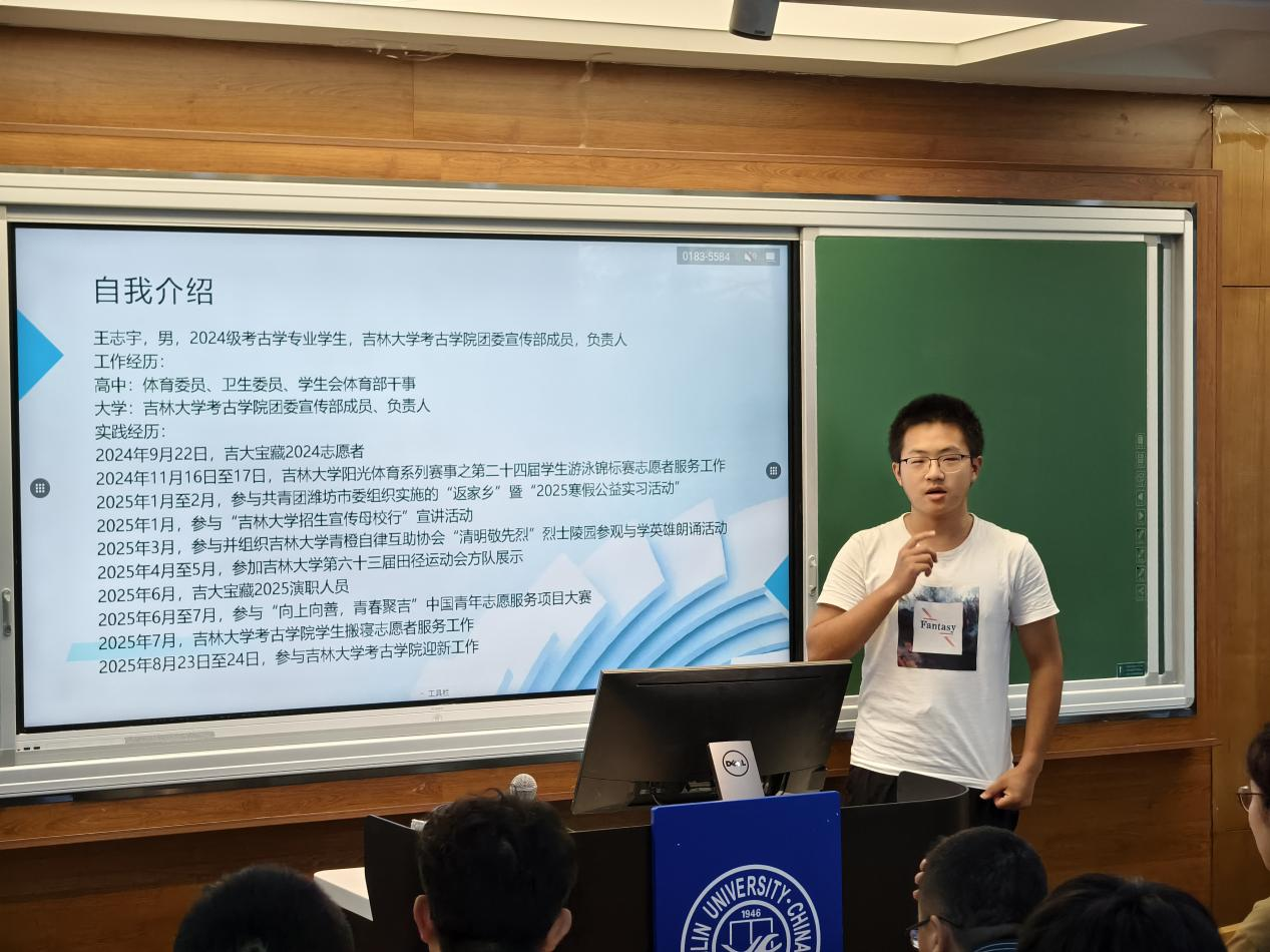 考古公司党委副书记兼副经理侯建峰老师,2024级考古班班主任赵里萌老师,2024级本科生辅导员马嘉男老师,2024级考古班、文物与博物馆班班委候选人及全体同学参与会议,会议由2024级本科生闫志璇主持。